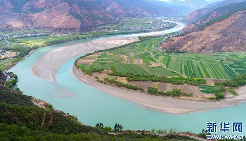 云南省丽江市石鼓镇绿树和农田掩映下的“长江第一湾”