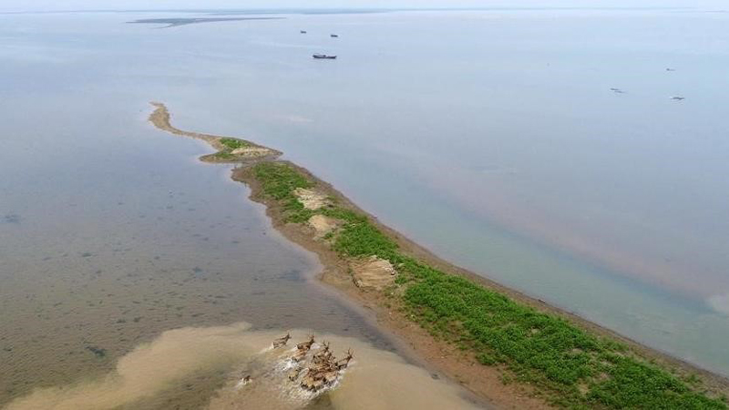 被野放的麋鹿在江西鄱阳湖湿地奔跑